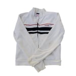 A crisp white zip-up track jacket featuring bold navy stripes and a fine red trim, finished with an embroidered England detail. Lightweight, sporty, and effortlessly cool. Perfect for layering or making a statement in casual streetwear. Maybe pair it with some beat up Reeboks from your local thrift shop.